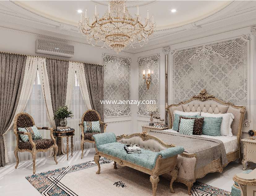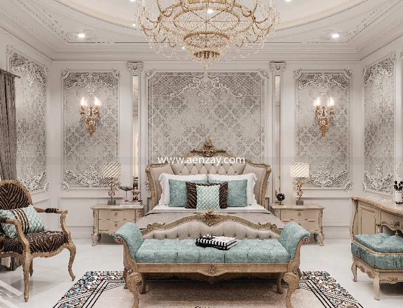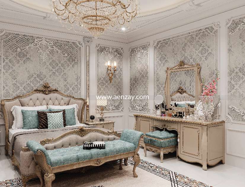This Bedroom reflects a feminine style with its soft color, elegant furniture, and artistic wall details. It creates a comfortable and peaceful luxury home design that has both beauty and practicality.