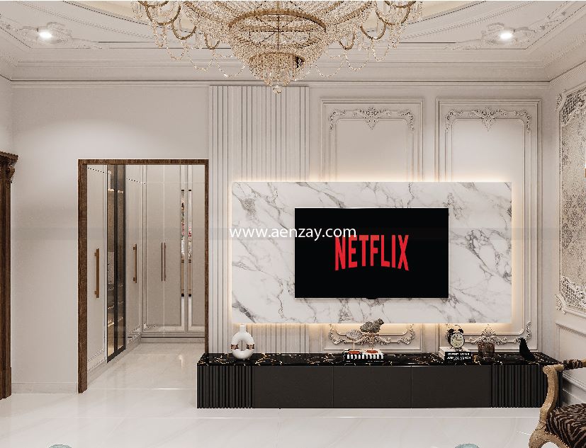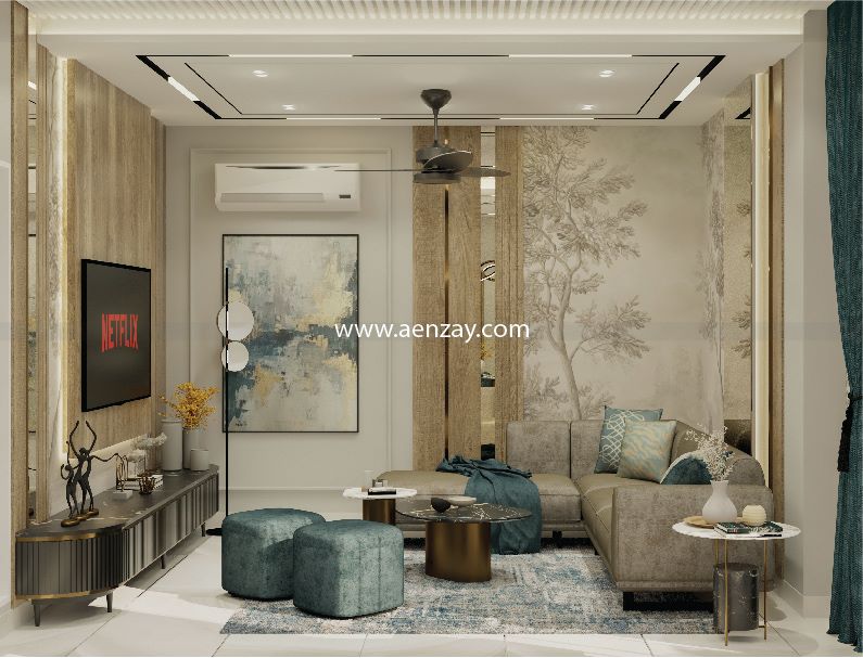 This room is designed with comfort and style in mind. With beautiful textures, natural lighting, & Cozy seating, it becomes the perfect space for relaxing and spending time with family. This room shows AenZay’s expertise in luxury home design.