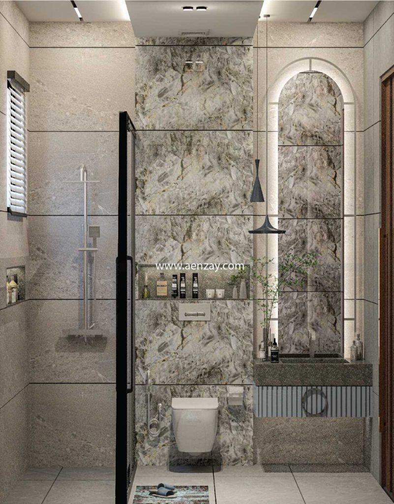 The washroom color tone matches the room and lighting; everything contributes to creating an ambiance that feels luxurious. AenZay bathroom features marble textures, glass details, and a floating vanity for a clean, modern look with just the right touch of warmth.