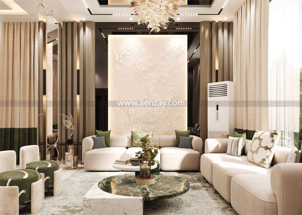 Luxurious Residence Interior Design by AenZay Interiors & Architects is a 15 Marla’s house in Laiyah. This luxury house has been designed especially for those individuals who want elegance and luxury in their houses. It has been specifically designed keeping in mind that both aesthetics and functionality can go hand in hand. In addition to having the right design concept, the house has an excellent combination of interior and architectural elements that make life easier for the residents. It comprises all of the qualities required in a modern, comfortable, and luxurious residence.