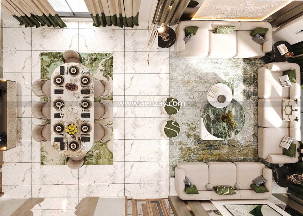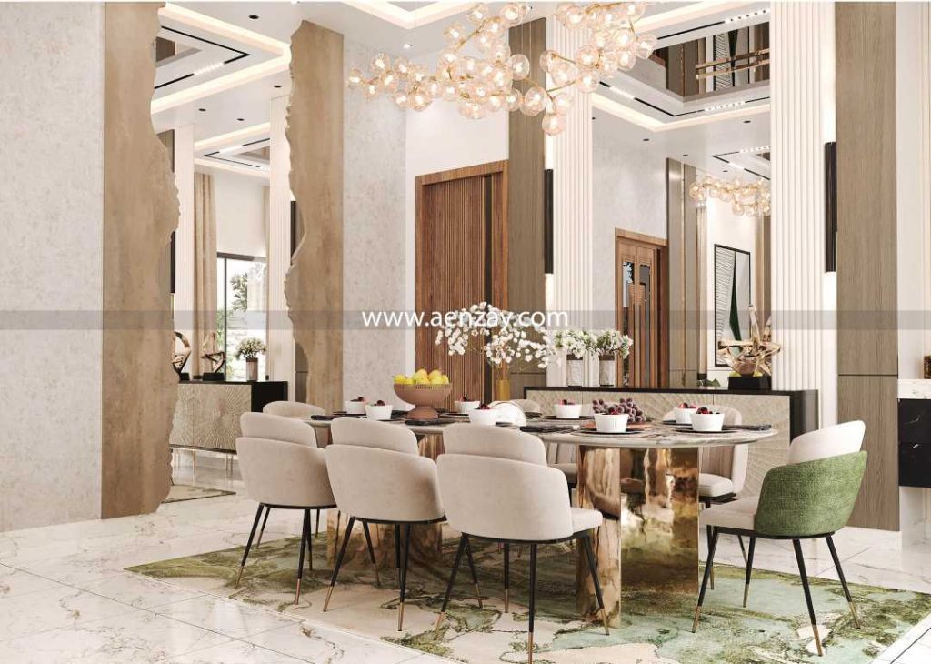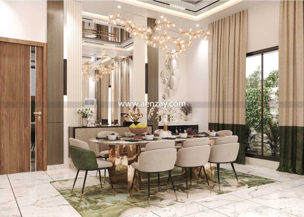 The drawing and dining areas reflect a balanced approach to Luxury Residence Interior Design where elegance and functionality come together The drawing room uses a soft palette of beige and green with sectional seating arranged around marble top tables while patterned cushions add texture Large windows with tall curtains bring in natural light and chandeliers with gold and crystal details create a strong visual focus while textured walls and simple décor add depth The dining area continues this theme with a marble table on a metallic base surrounded by upholstered chairs in soft tones enhanced by subtle centerpieces and artwork while polished flooring and layered rugs add warmth Lighting fixtures and console styling complete the space creating a cohesive and refined environment that reflects Luxury Residence Interior Design