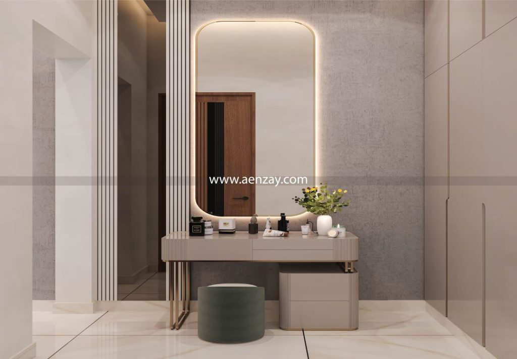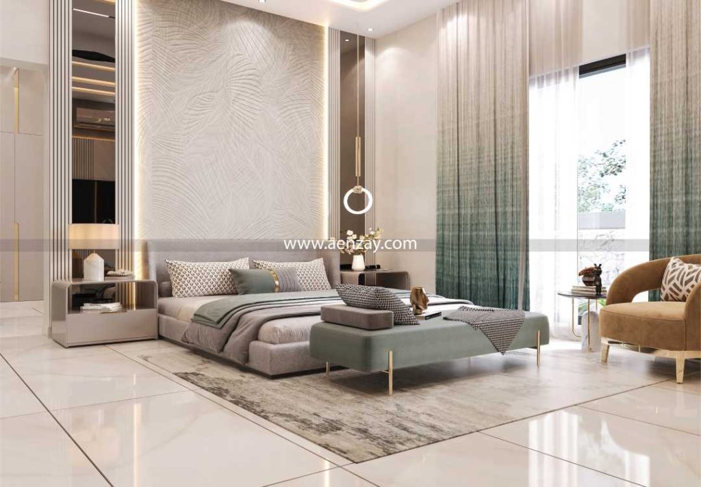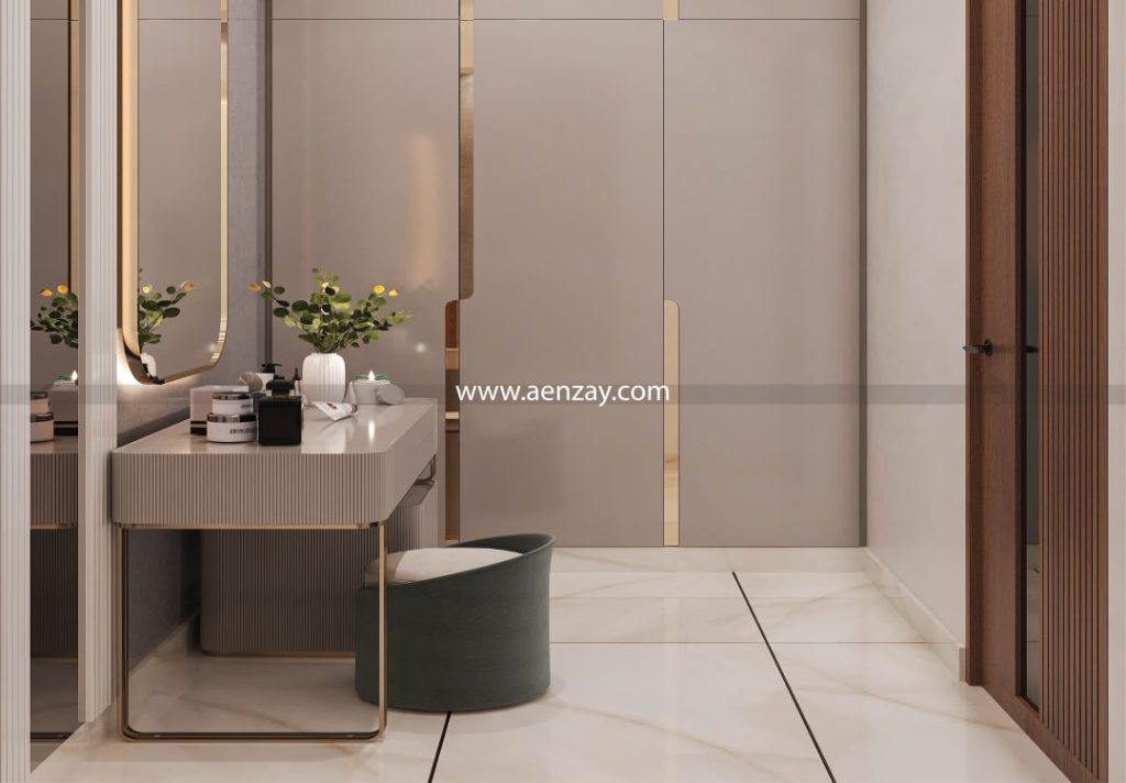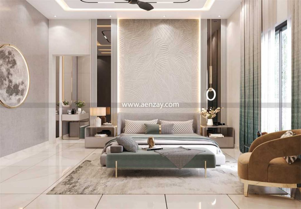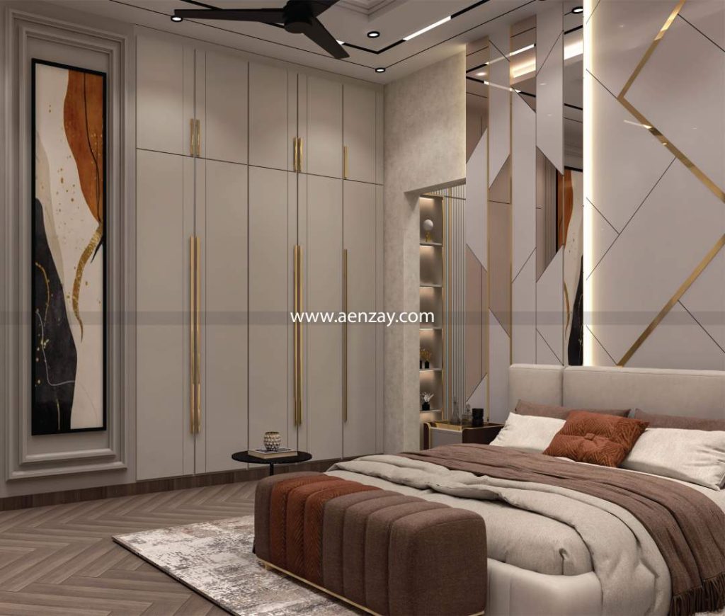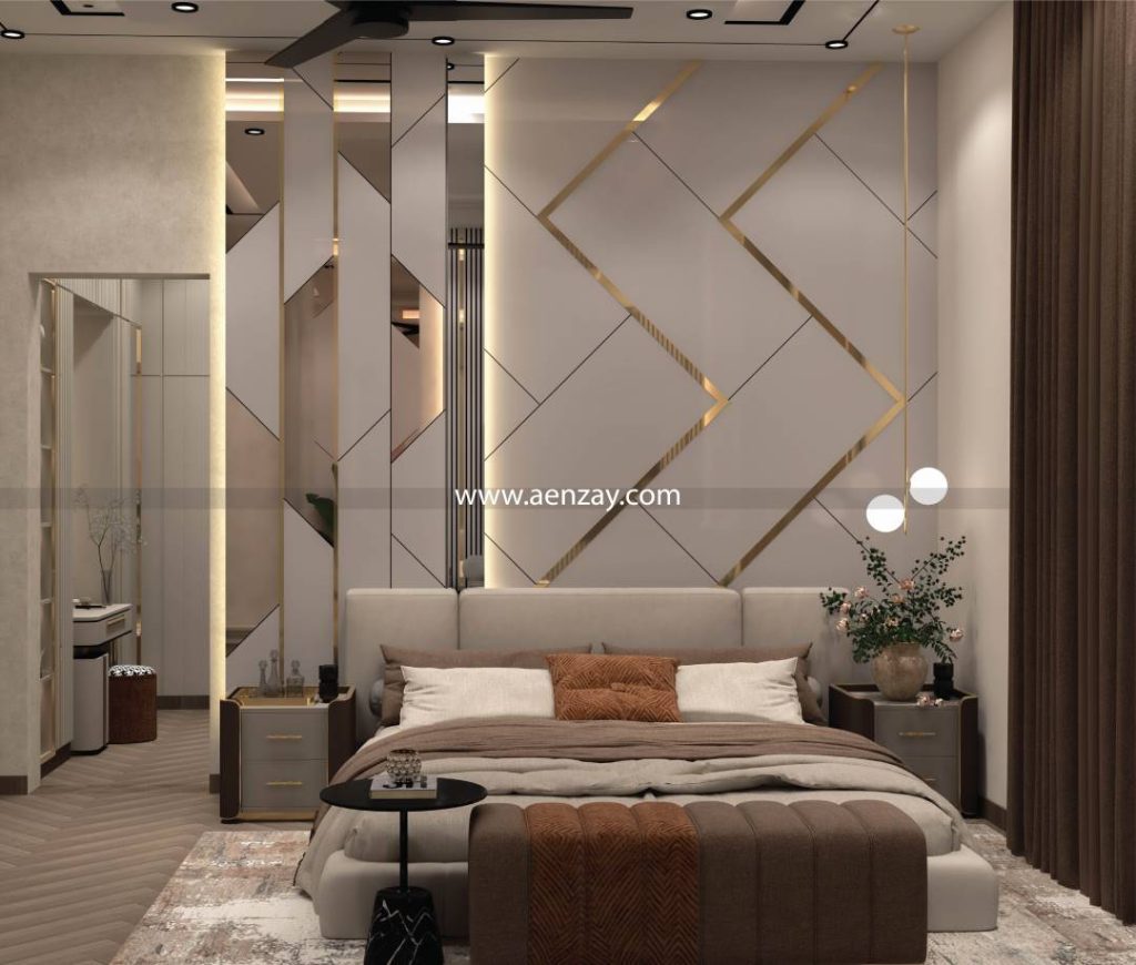 The master suite at this  Luxury Residence Interior Design is the perfect blend of comfort and timeless elegance A grand upholstered bed sits at the center surrounded by warm beige brown and rust tones that create a calm and inviting atmosphere Geometric wall panels in cream and gold are softly backlit to form a striking focal point while pendant lighting and carefully chosen décor add a subtle touch of sophistication The wardrobe area is seamlessly integrated with sleek finishes and golden accents and the built-in cabinetry with accent lighting and artistic niches turns storage into a feature of luxury The herringbone wood flooring and textured area rug complete the space bringing balance and warmth together This master suite reflects AenZay Interiors and Architects approach of combining style with function creating a space that is not just for rest but a full experience of luxury living.