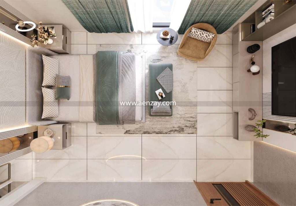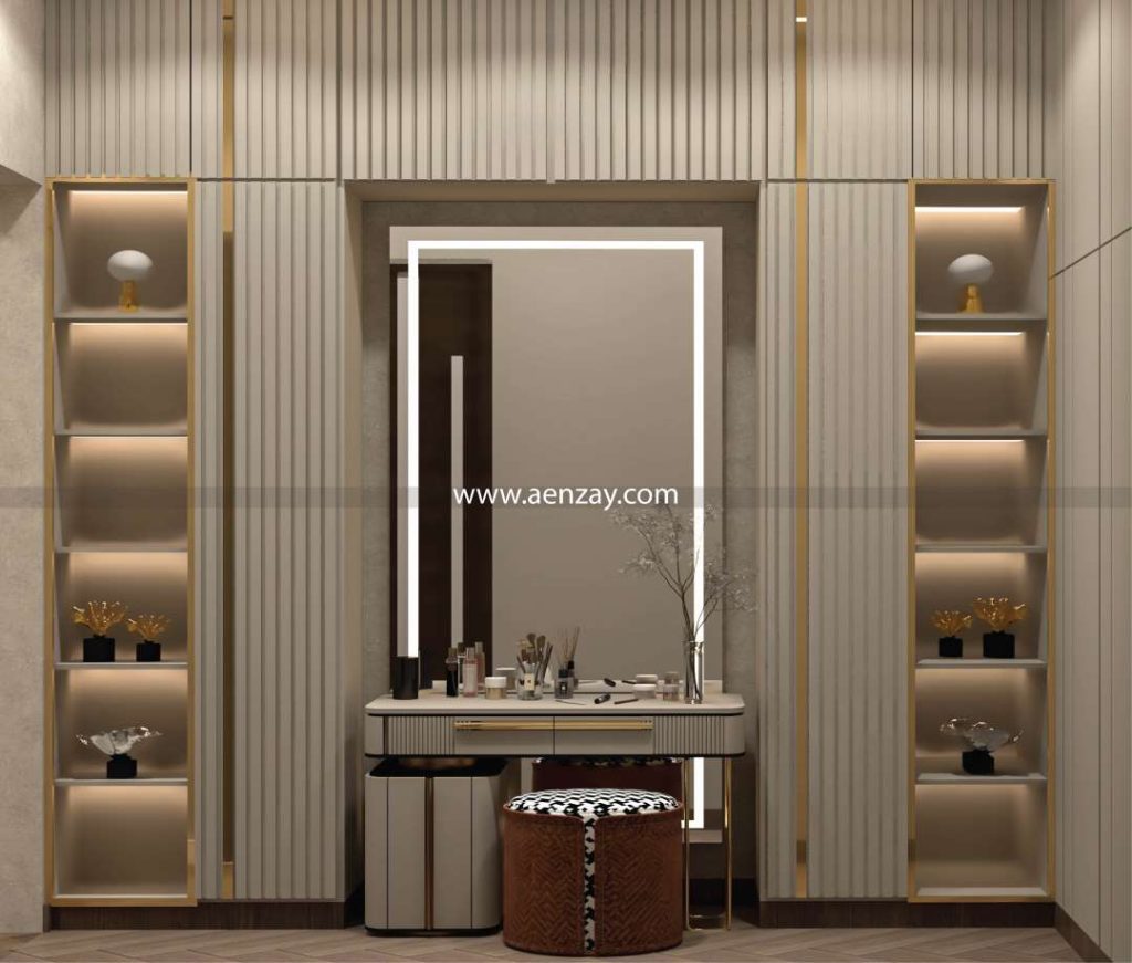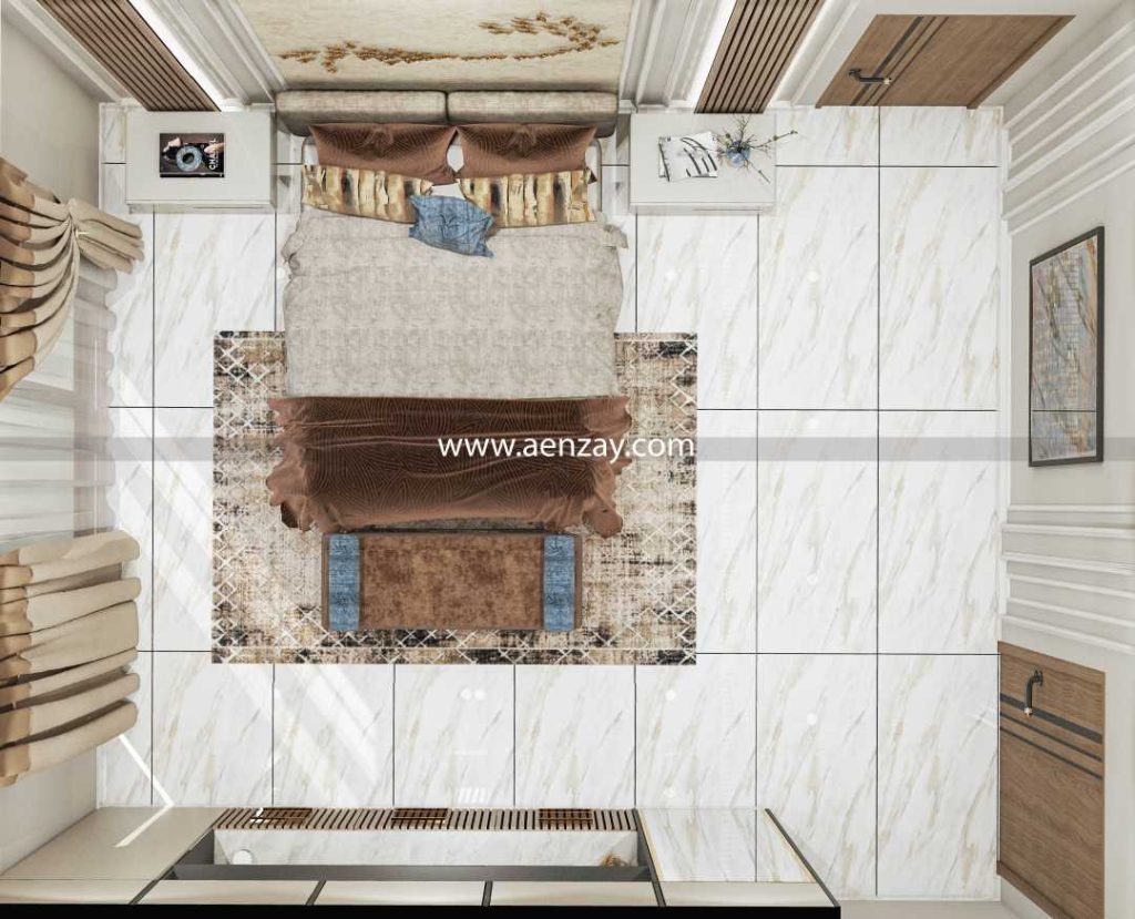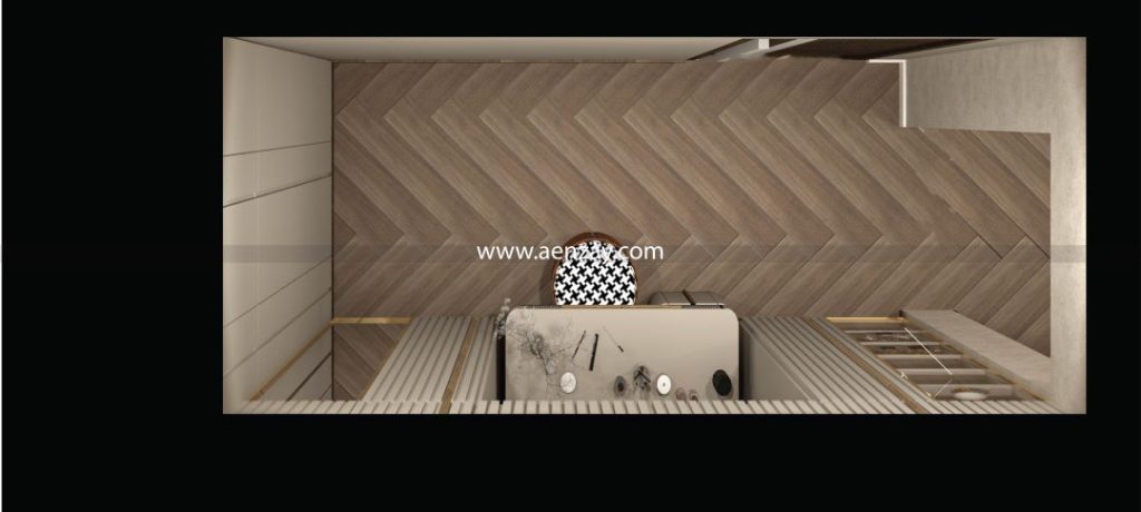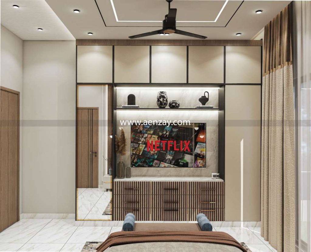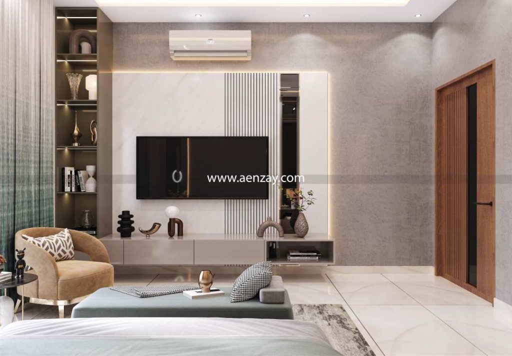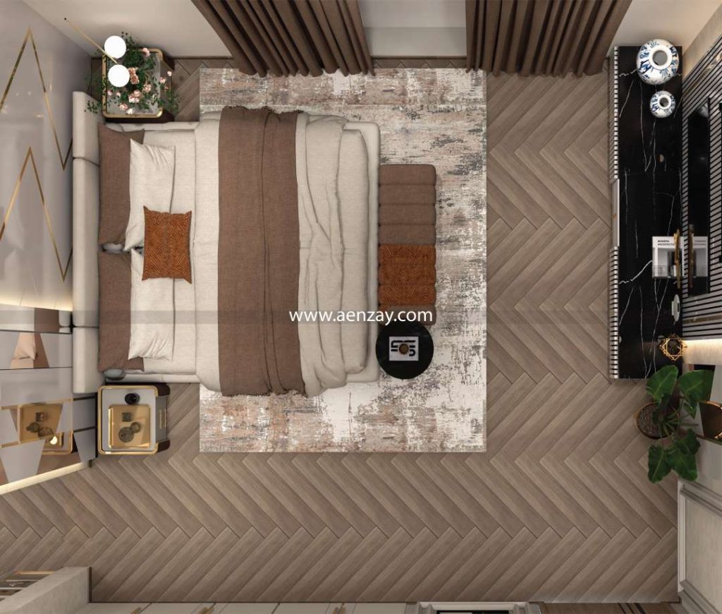 The master suite at this  Luxury Residence Interior Design is the perfect blend of comfort and timeless elegance A grand upholstered bed sits at the center surrounded by warm beige brown and rust tones that create a calm and inviting atmosphere Geometric wall panels in cream and gold are softly backlit to form a striking focal point while pendant lighting and carefully chosen décor add a subtle touch of sophistication The wardrobe area is seamlessly integrated with sleek finishes and golden accents and the built-in cabinetry with accent lighting and artistic niches turns storage into a feature of luxury The herringbone wood flooring and textured area rug complete the space bringing balance and warmth together This master suite reflects AenZay Interiors and Architects approach of combining style with function creating a space that is not just for rest but a full experience of luxury living.