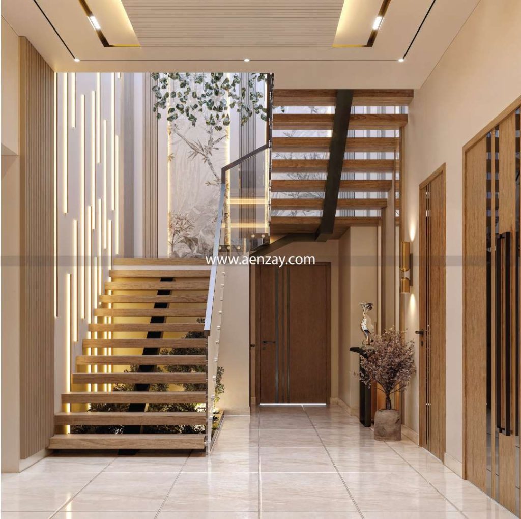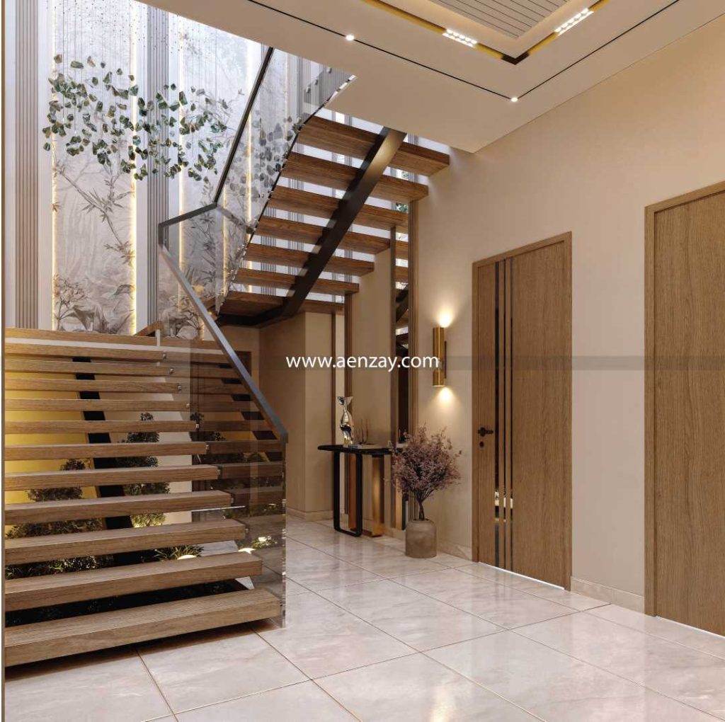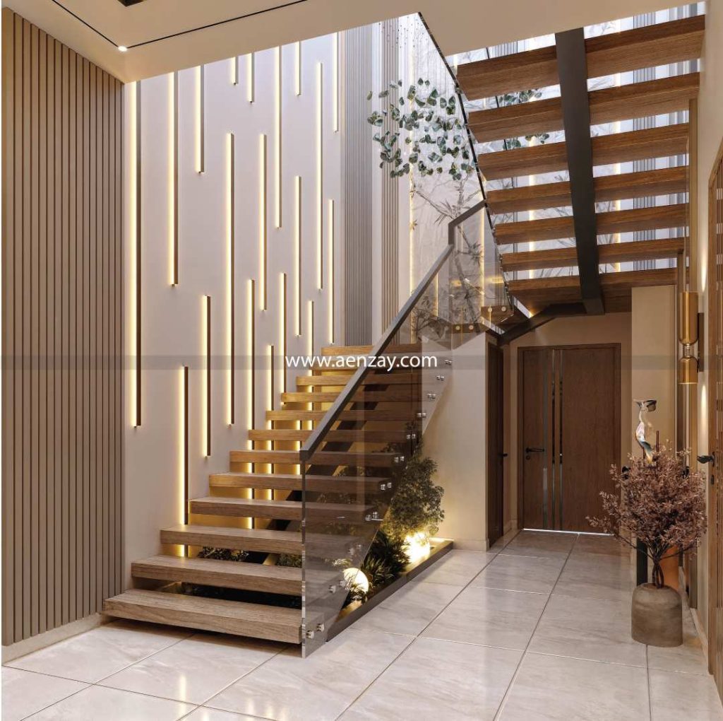 The stair lobby in this house is an outstanding feature that links the different floors of the house in style and grace Wood stairs with glass railings form a stylish design element, and vertical LED lighting on the walls provides a sophisticated touch Ornamental plants beneath the stairs and sculptures help to soften the sleek design and provide balance in the lobby area Reflective flooring helps to highlight the interior lighting, adding brightness to the room, while the use of textured walls and ornate decorations provides added dimension The lobby is not only a functional area but also a work of art