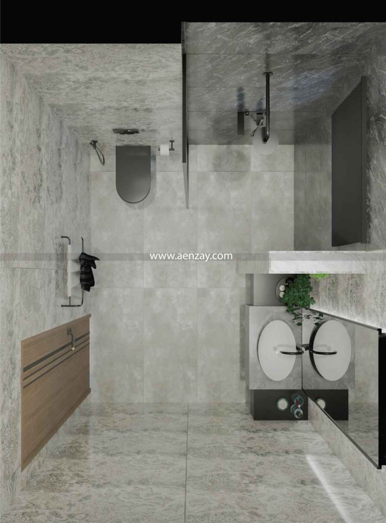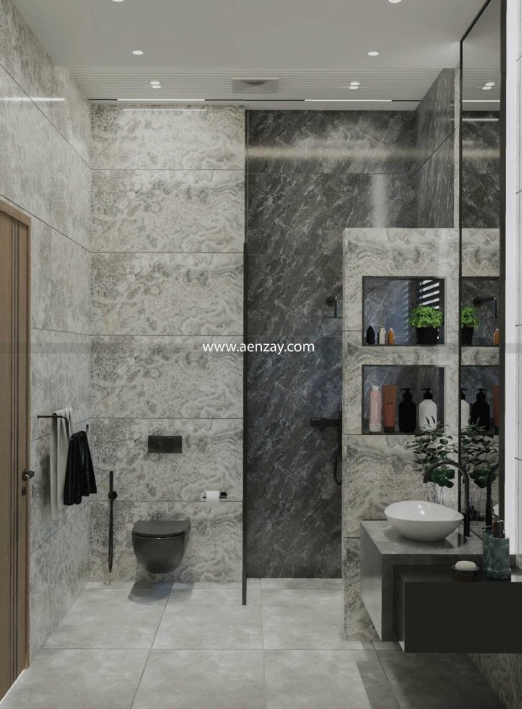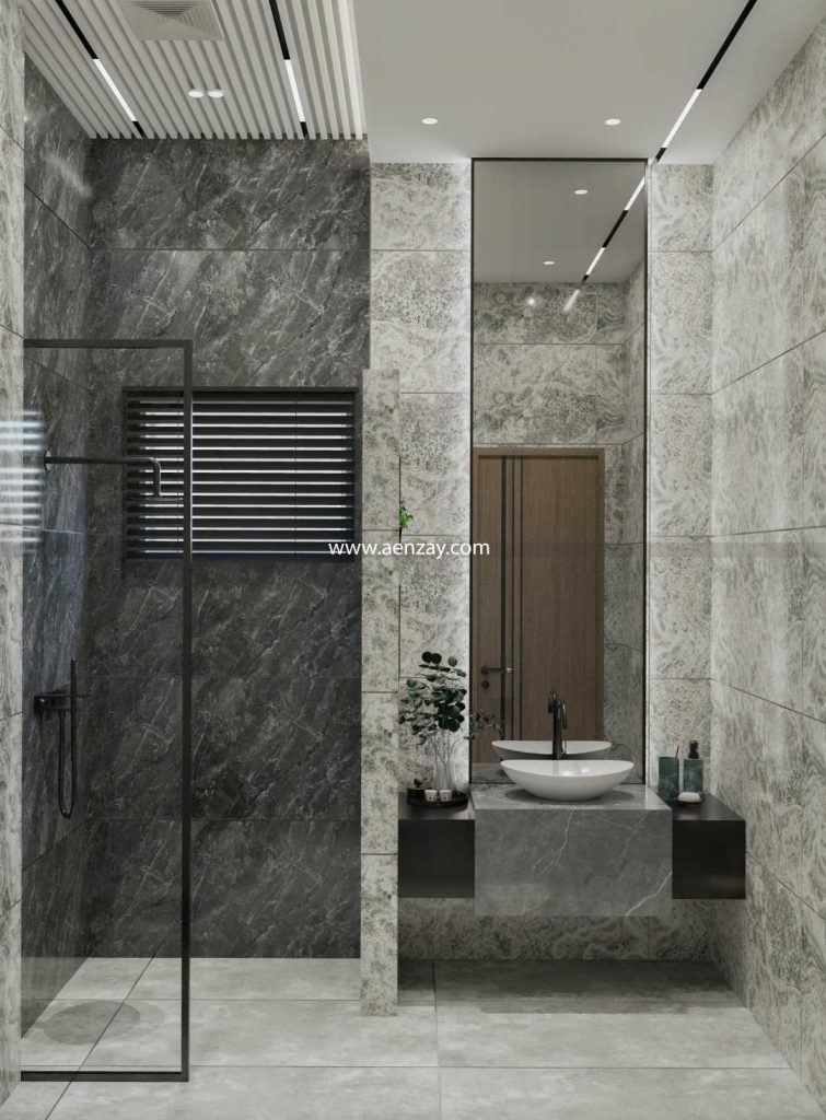 The kid’s bathroom in the home has been designed in such a manner that it keeps its elegance. Grayish marble texture was used in order to provide an elegant look inside the bathroom. The elegance inside the bathroom has been maintained through the use of contemporary vanity countertop and basin sink. Black elements are included for contrasting effect, making the design elegant. The main consideration in this interior design have been ease of use of the room. This makes sure that there is no difficulty for the children using the place. This is made possible through the minimal use of lighting fixtures, basic materials, and minimal decoration