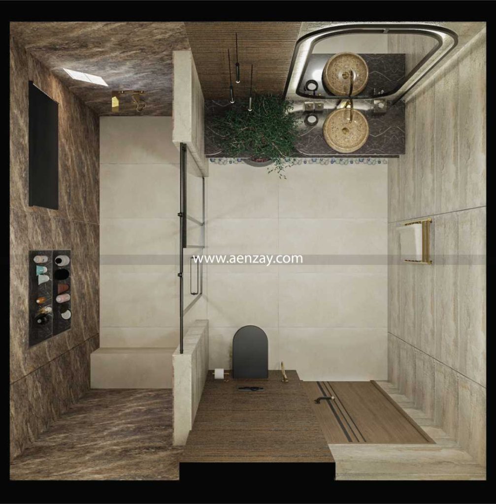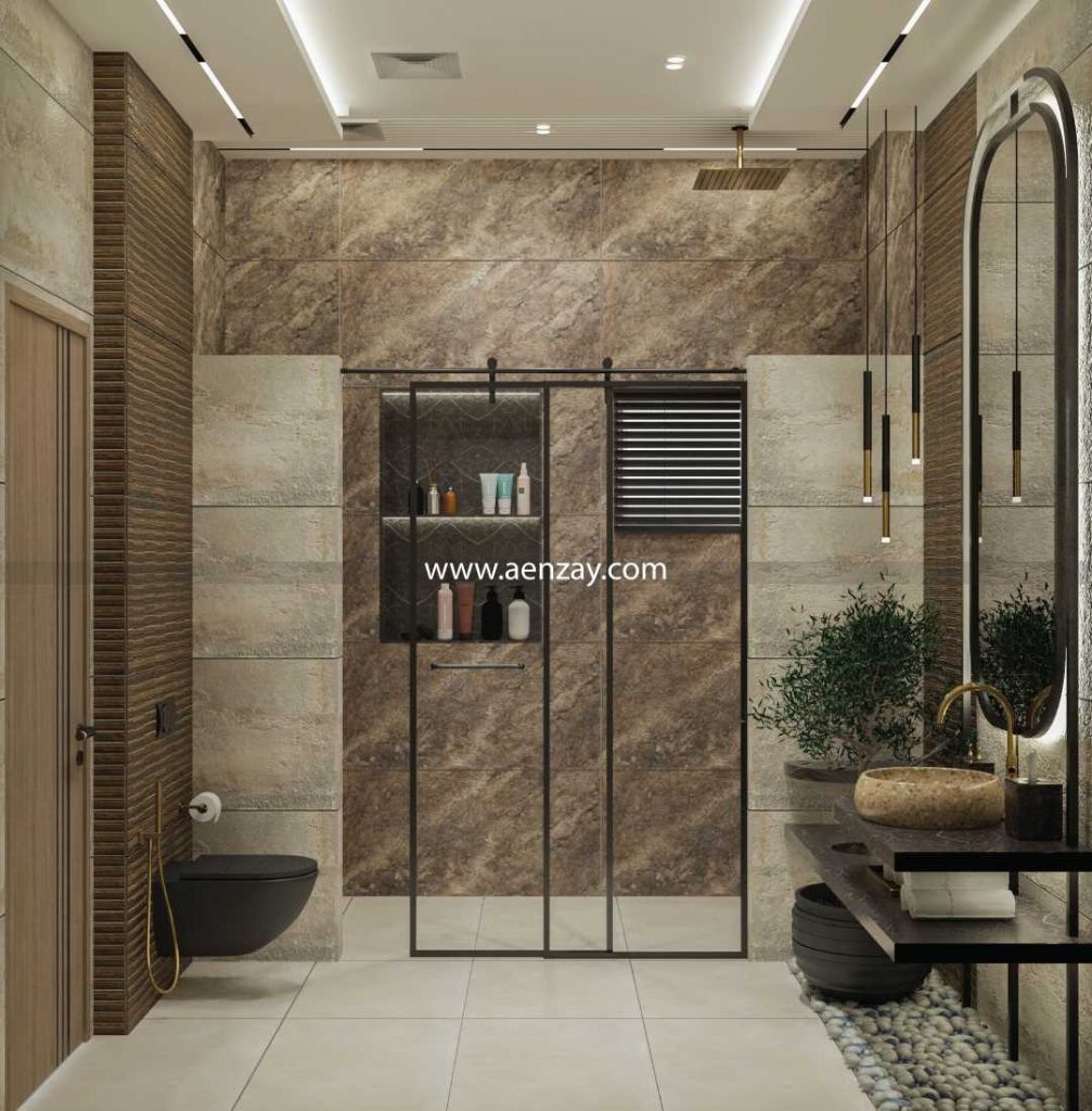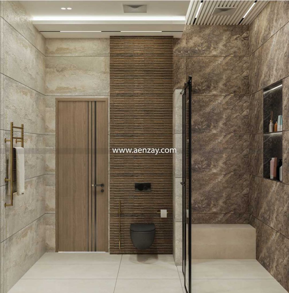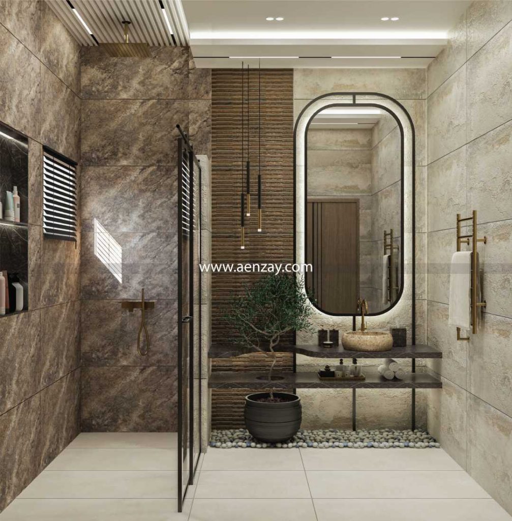 The master bathroom of this Luxury Residence Interior Design represents elegance in its truest form and is built to make you enjoy your spa time right in your home. The walls of the master bathroom are lined with beautiful stone texture in shades of beige and brown colors, which add elegance to the room along with natural beauty. Gold accents have been used to enhance the beauty of the accessories of the master bathroom. A glass shower enclosure along with a rainfall system has been installed in this bathroom room. The vanity area comes with a natural stone basin and gold faucets.