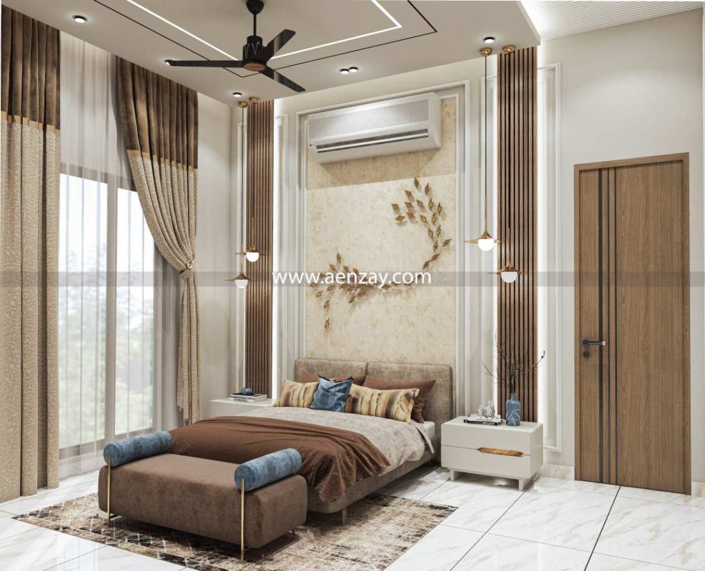 The guest bedroom reflects a warm and refined approach to Luxury Residence Interior Design where comfort meets subtle elegance A central upholstered bed in soft beige tones is styled with brown bedding and accent cushions in blue and beige creating a balanced and inviting palette A bench at the foot of the bed adds both function and style while patterned rugs bring depth to the space The feature wall with golden leaf details and vertical wooden panels creates a strong focal point supported by soft pendant lighting while matching side tables with simple décor maintain symmetry The ceiling with recessed lighting and a sleek fan keeps the space modern while marble flooring and layered curtains allow natural light to soften the overall look A contemporary TV unit with wood and marble elements adds practicality without taking away from the design making the room a clean and timeless example of Luxury Residence Interior Design