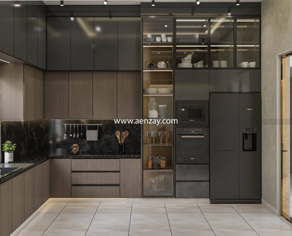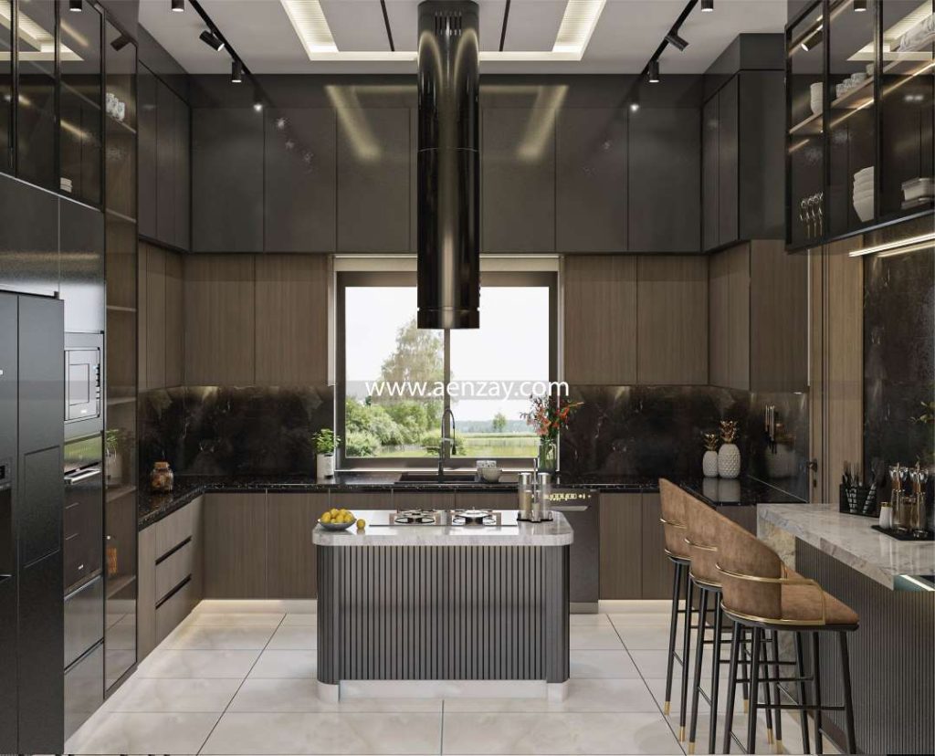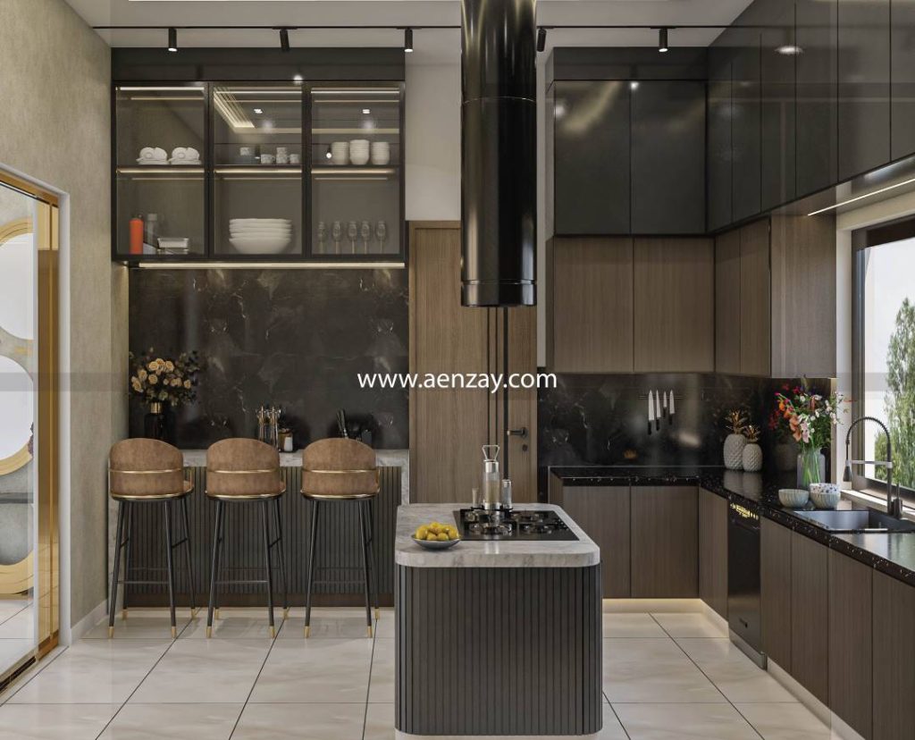 The main kitchen reflects a refined approach to Luxury Residence Interior Design where modern function meets timeless elegance Dark cabinetry with a mix of matte and glossy finishes creates a clean backdrop paired with marble countertops and a central island that also works as a breakfast space with warm toned seating and subtle gold accents Integrated appliances are neatly built into the cabinetry while glass cabinets add both display and practicality The marble backsplash enhances the overall look while under cabinet lighting and ceiling lights keep the space warm and well lit Large windows bring in natural light which balances the darker tones and keeps the kitchen feeling open Simple decorative elements like fruit bowls and flowers add life without disturbing the layout Every detail from textures to finishes makes the kitchen a practical yet visually strong part of this Luxury Residence Interior Design