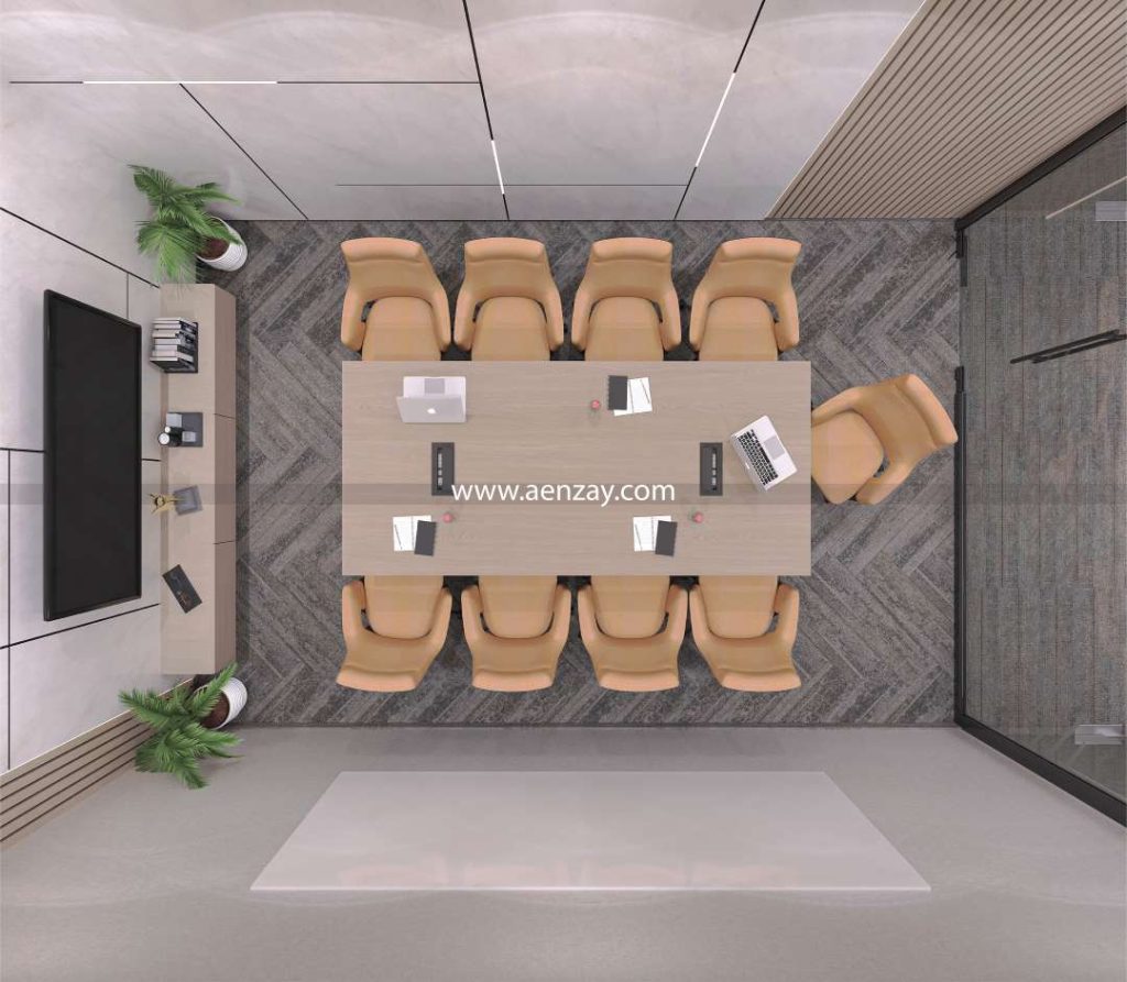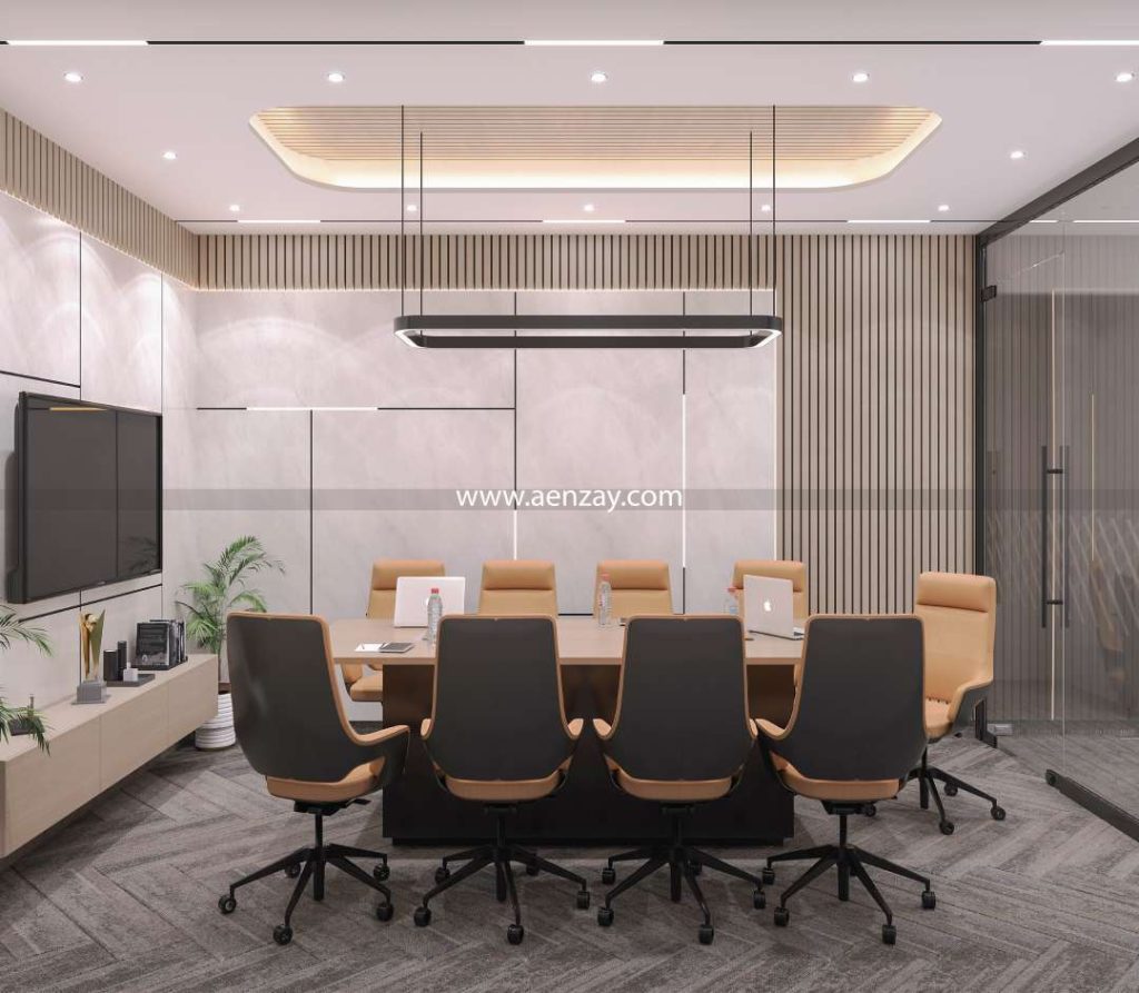 The meeting room is built for focus and discussion. A long table with ergonomic seating supports team interaction and presentations. The layout keeps communication clear and effective. Wooden panels, ceiling details, and soft lighting add depth. Technology is integrated in a simple way to keep the room practical. This space supports collaboration within a modern office environment in Gujranwala.
