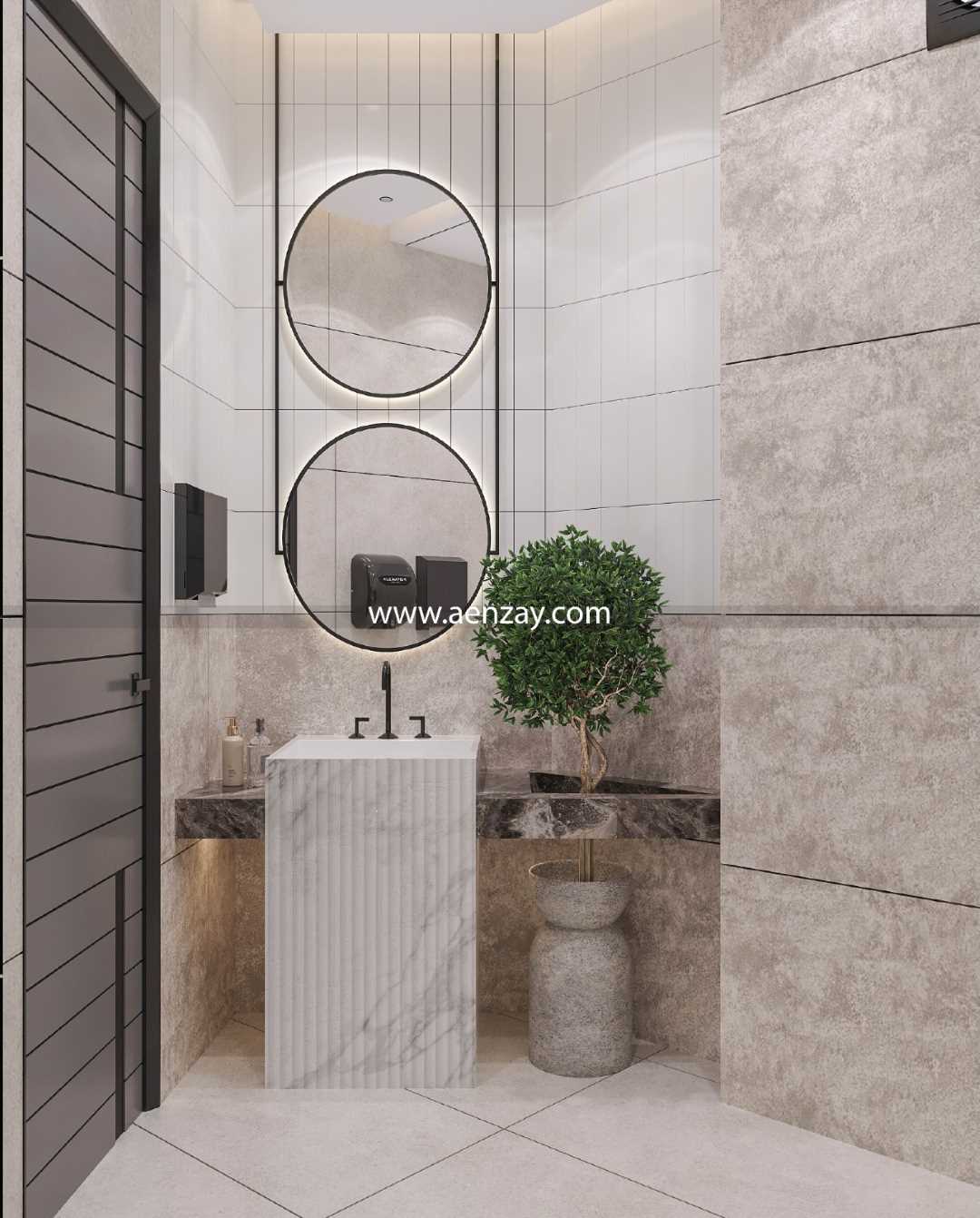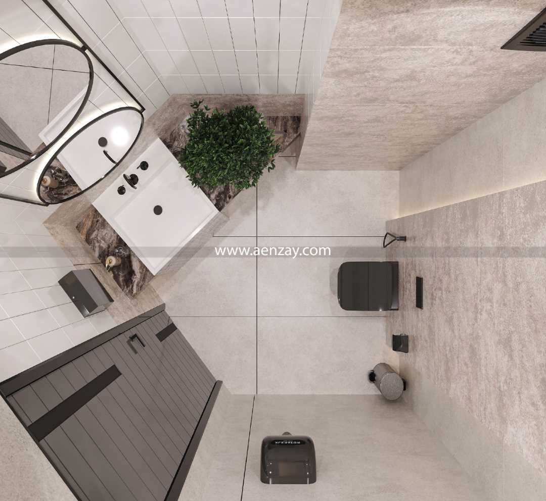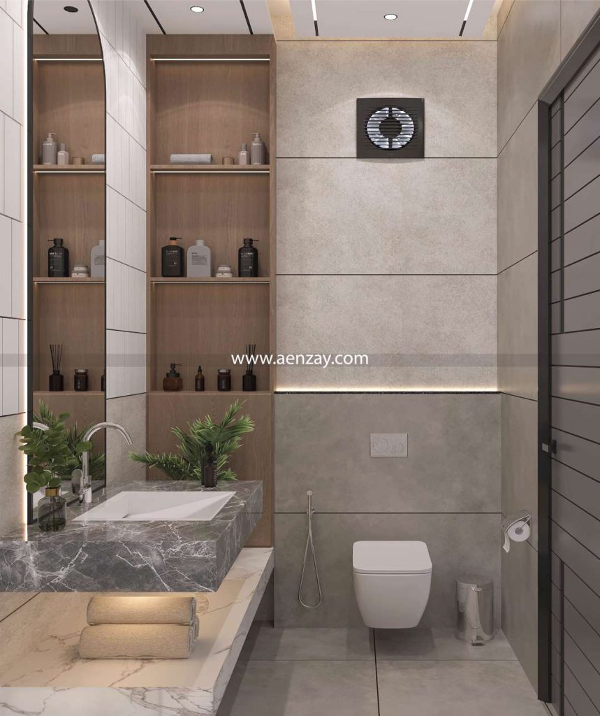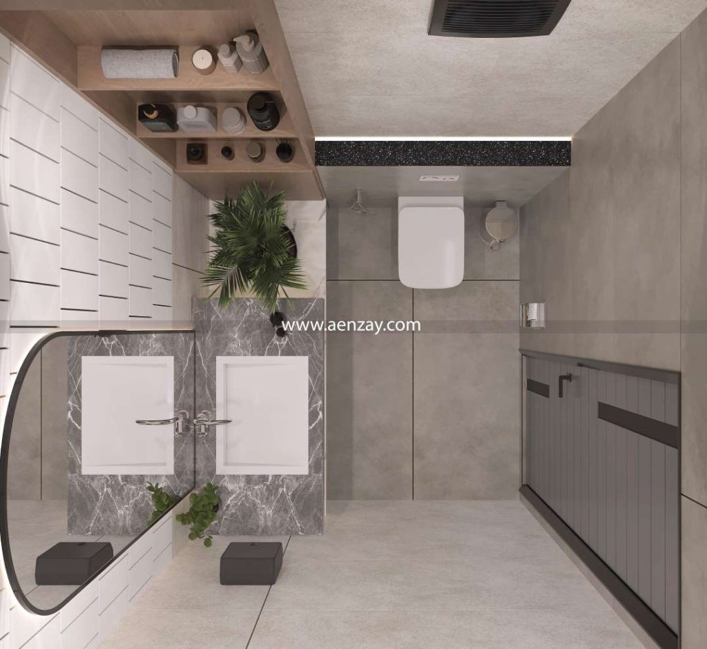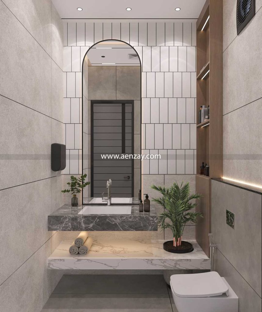 The CEO bath follows a clean and minimal approach. The interior design of this room is characterized by simplicity in terms of the white color used for the walls and the furniture in addition to the white marble countertops and the fixtures which have been attached to the wall. The incorporation of shelving units along with a touch of greenery has been done while being careful about not overcrowding the space. The room is functional and sturdy, too. This space aligns with modern office design Gujranwala, where even smaller areas are designed with purpose.
