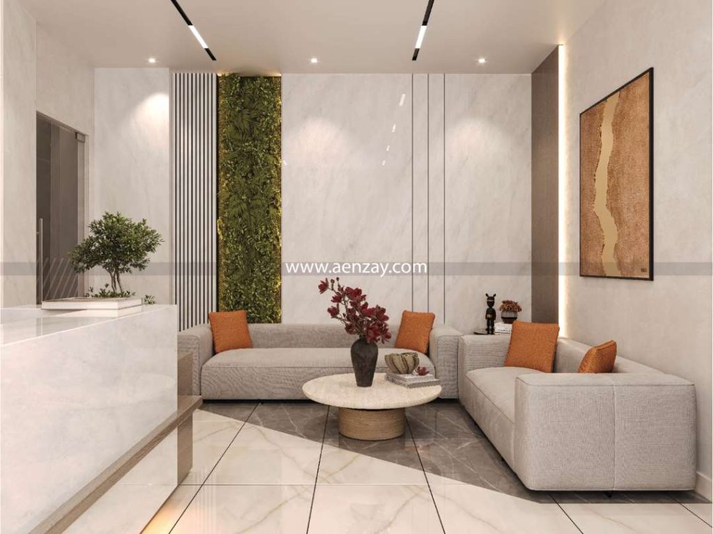 This area has been set up with the aim of creating an excellent initial impression on the visitors. This area has a very elegant appearance with marble flooring, good lighting, and modern furniture pieces. The reception desk has been arranged in such a way that there is nothing but elegance about it along with a good placement. There are chairs with cushioned seating along with some green plants. Some wall panels and lighting fixtures give a very neat modern appearance to this area.