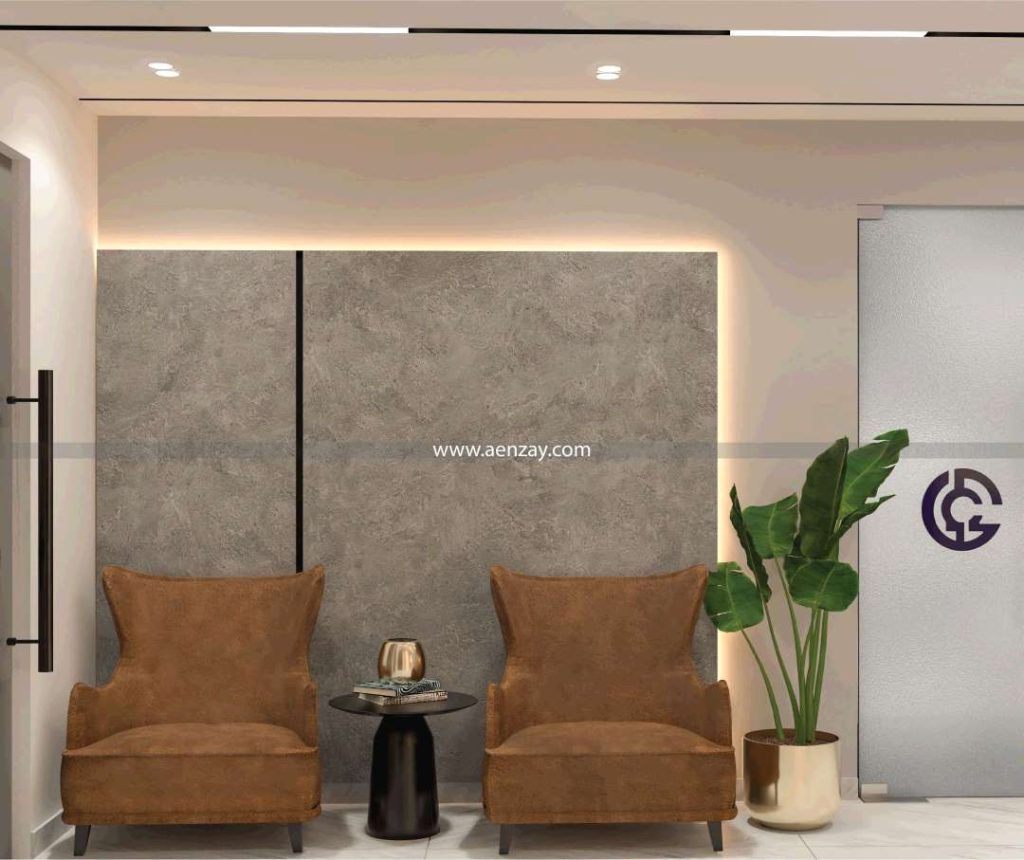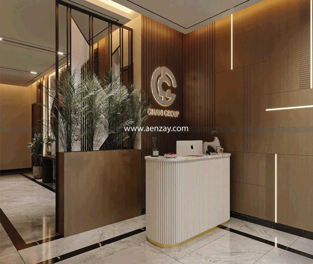 Aenzay designed this reception as a corporate office interior design lahore space that creates a strong first impression with marble finishes a modern desk and warm lighting comfortable seating keeps visitors at ease while art greenery and subtle details add depth this luxury office interior design lahore approach reflects a modern office interior project pakistan where function and a welcoming feel come together