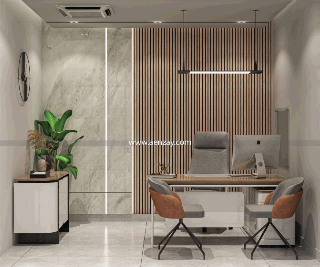 Aenzay designed this Finance Manager workspace as a corporate office interior design lahore space with a sleek desk ergonomic seating and guest chairs that support planning and discussions vertical wooden accents marble finishes and subtle decor add warmth while natural light and greenery keep the space balanced this luxury office interior design lahore approach reflects a modern office interior project pakistan built for focus precision and clear decisions