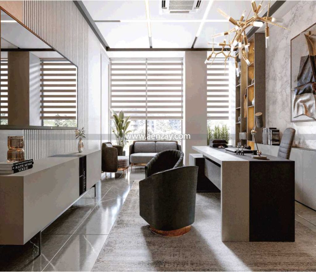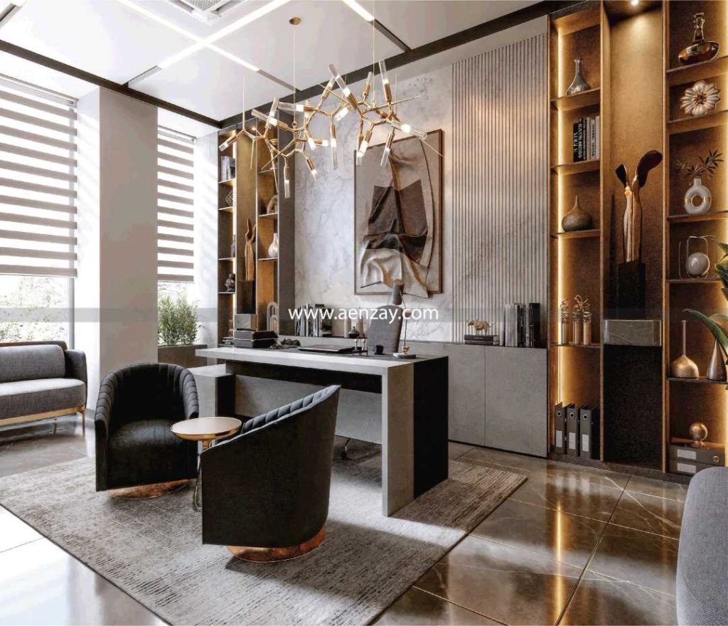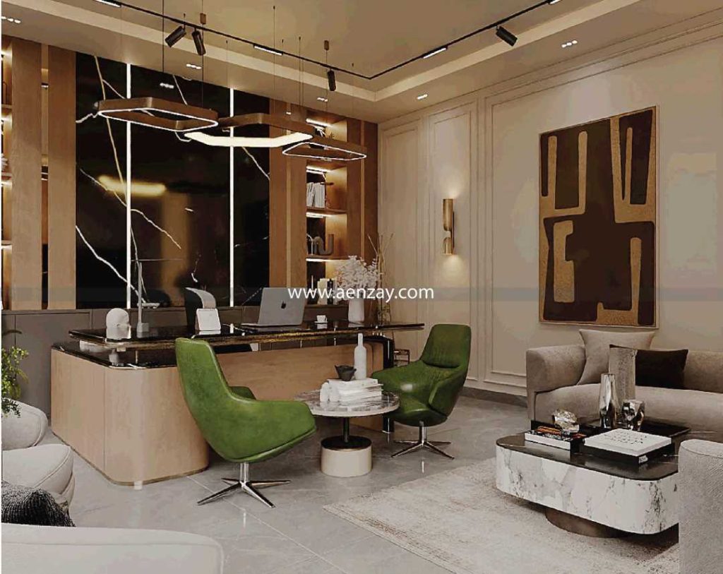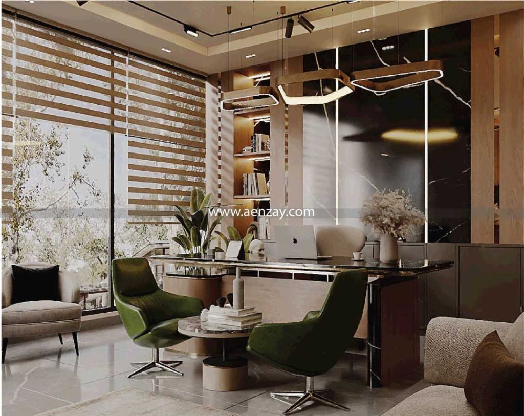 AenZay designed this space as a corporate office interior design lahore setting that reflects strong leadership and a clear sense of presence the large desk with refined seating creates a space that feels both commanding and welcoming for meetings and daily decisions black marble accents soft lighting and built in shelving add depth and a sense of structure while natural light and greenery keep the space balanced and comfortable this luxury office interior design lahore approach reflects a modern office interior project pakistan where authority style and function come together in a practical way