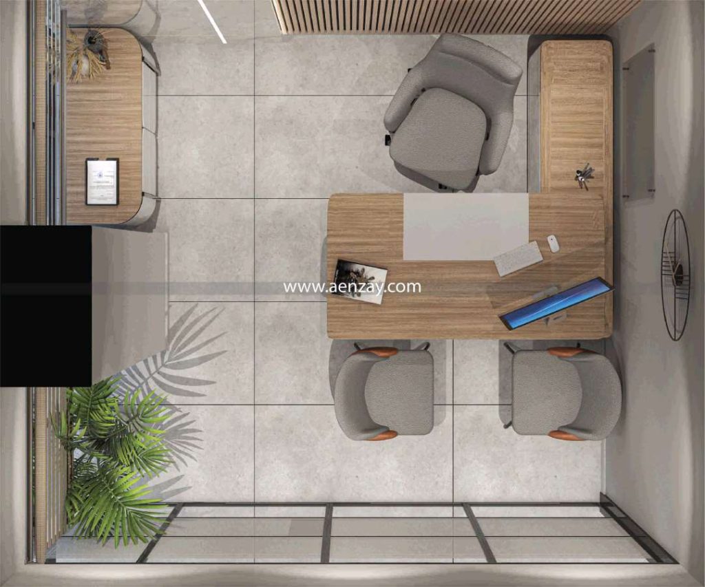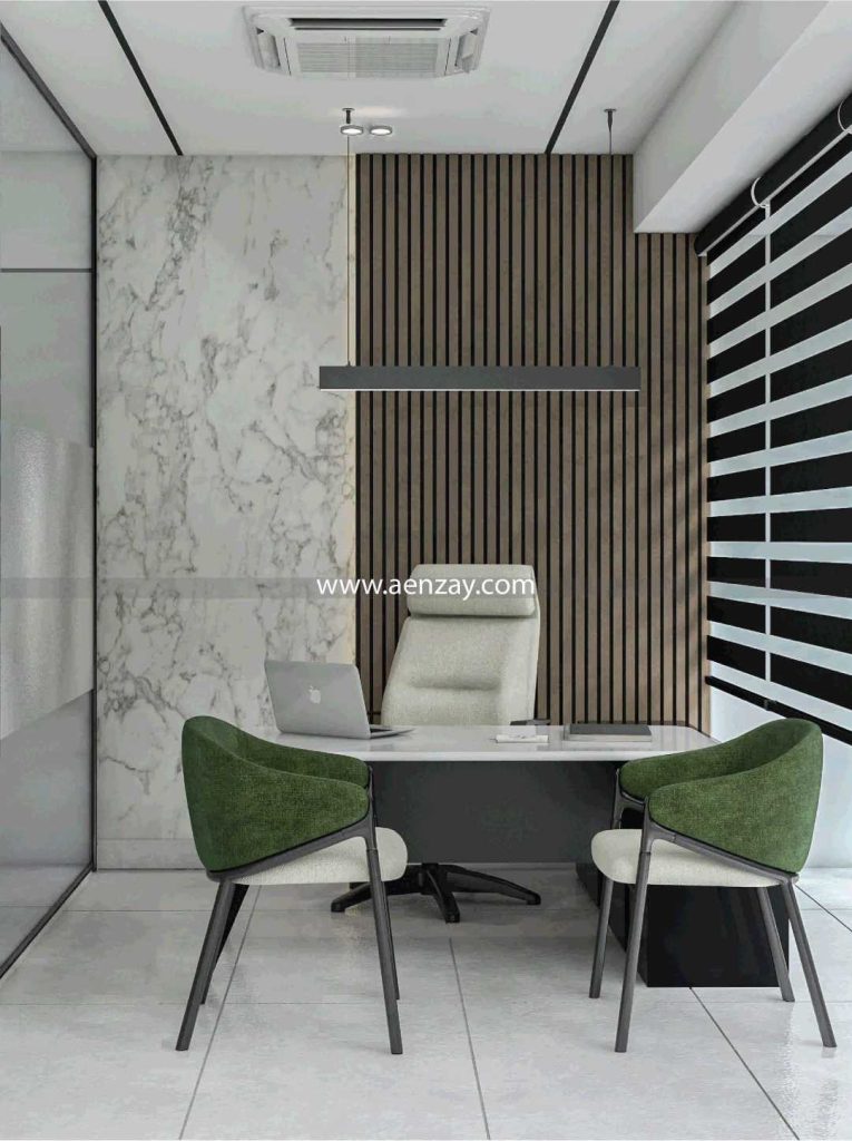 Aenzay designed this Director CFO office as a space with a sleek desk ergonomic seating and guest chairs that support collaboration neutral tones marble finishes and a vertical wooden wall add a strong yet warm feel while natural light and greenery bring balance this approach reflects a modern workspace built for leadership and smart decisions