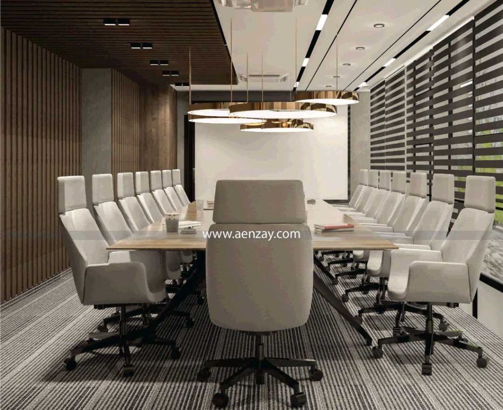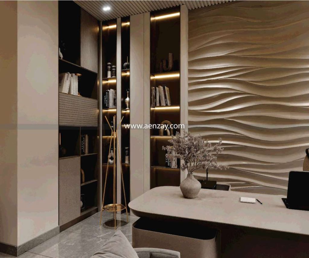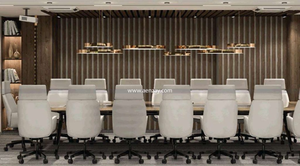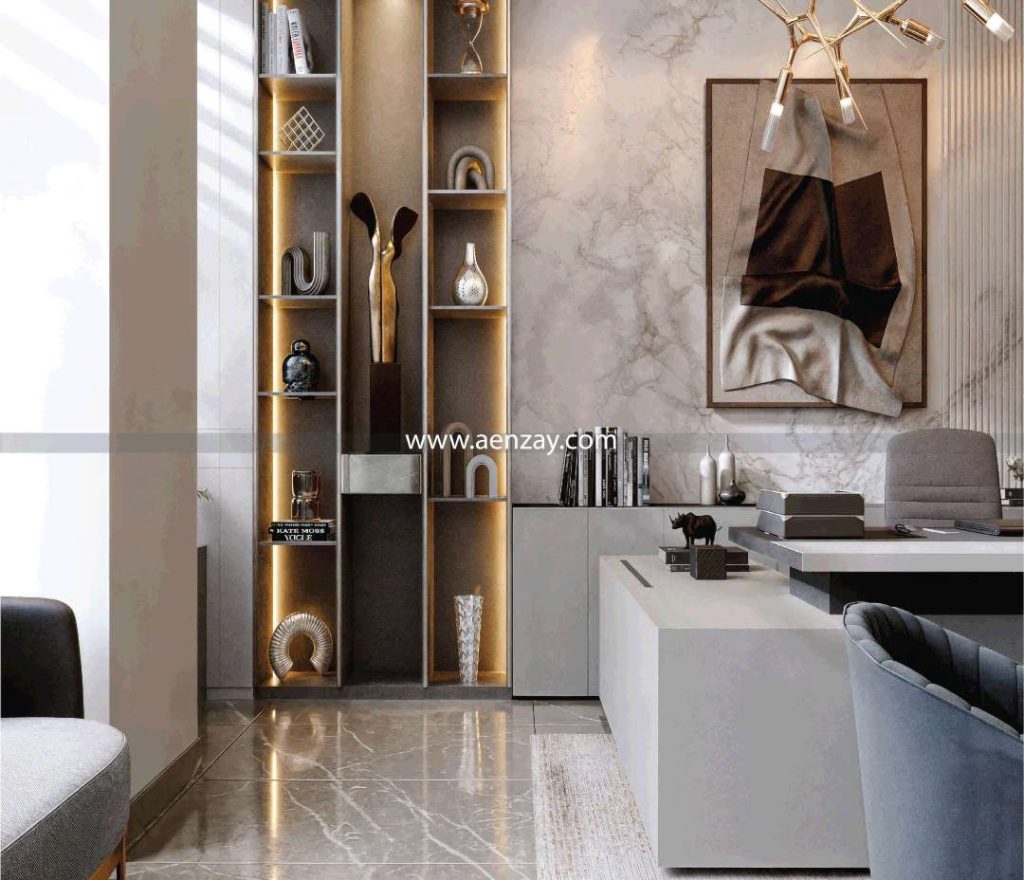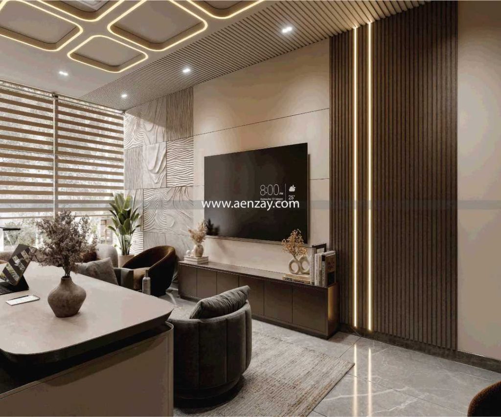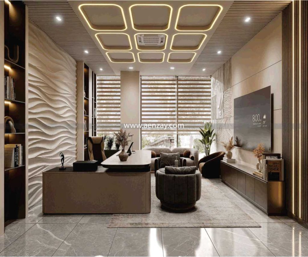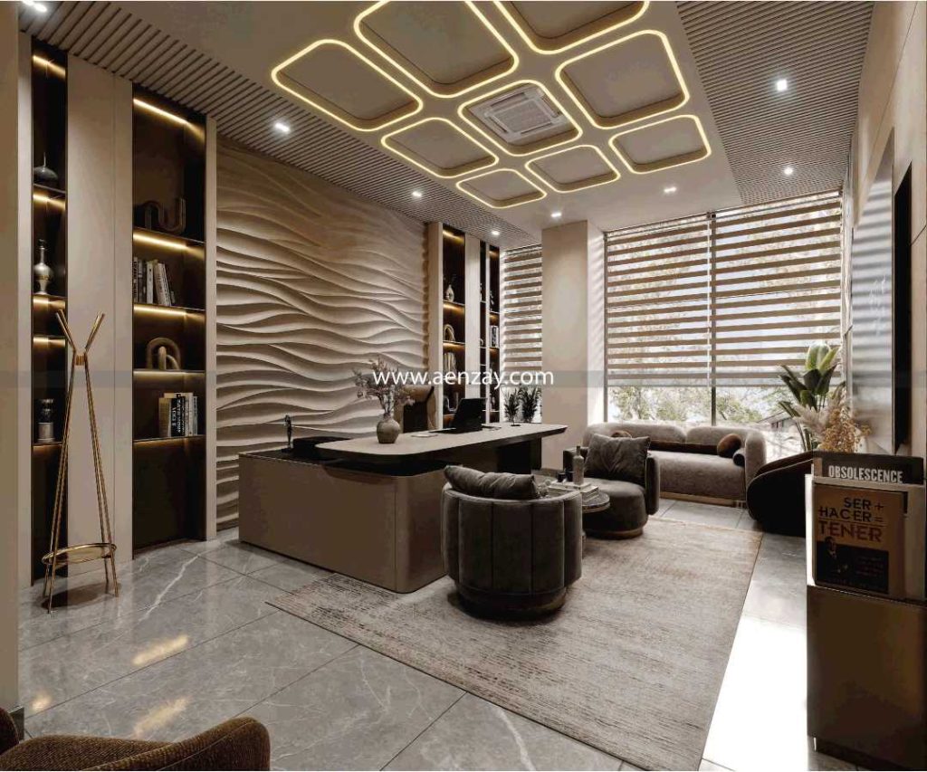 Aenzay designed this space as a corporate office interior design lahore setting with a sleek desk ergonomic seating and guest chairs that support leadership and daily work textured panels lit shelving and statement lighting add depth while natural light and greenery keep the space calm and balanced this luxury office interior design lahore approach reflects a modern office interior project pakistan were style and function work together