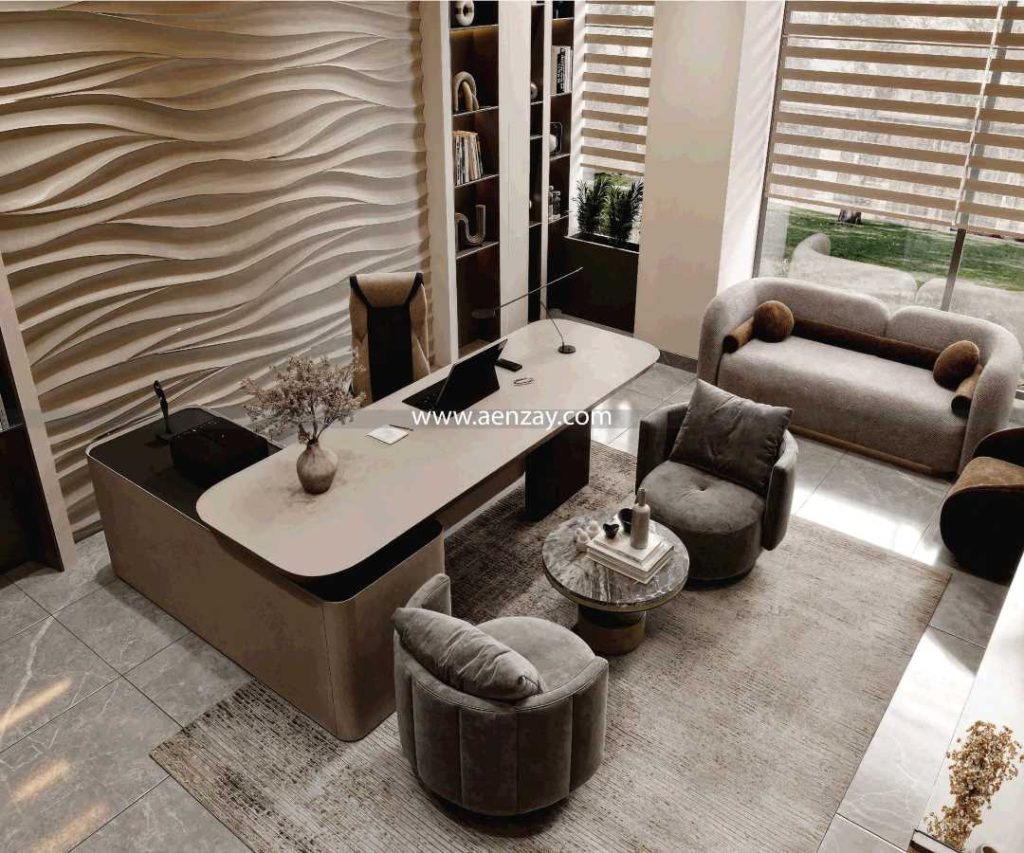 Aenzay designed this executive PR office as a space with clean lines neutral tones and soft gold accents that reflect brand identity the ergonomic desk and seating support comfort while textured walls add depth this concept fits a modern workspace where style meets daily function
