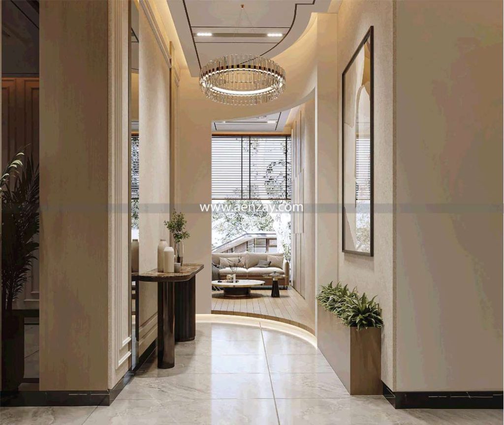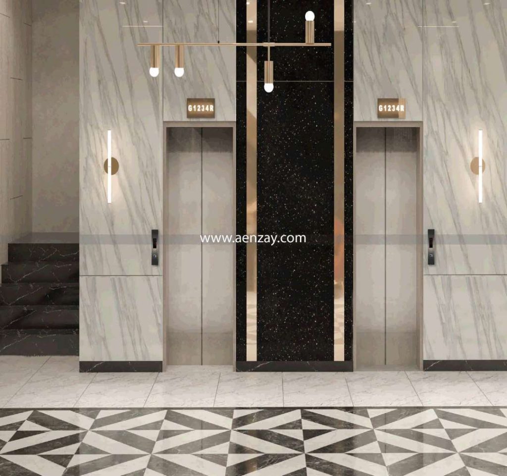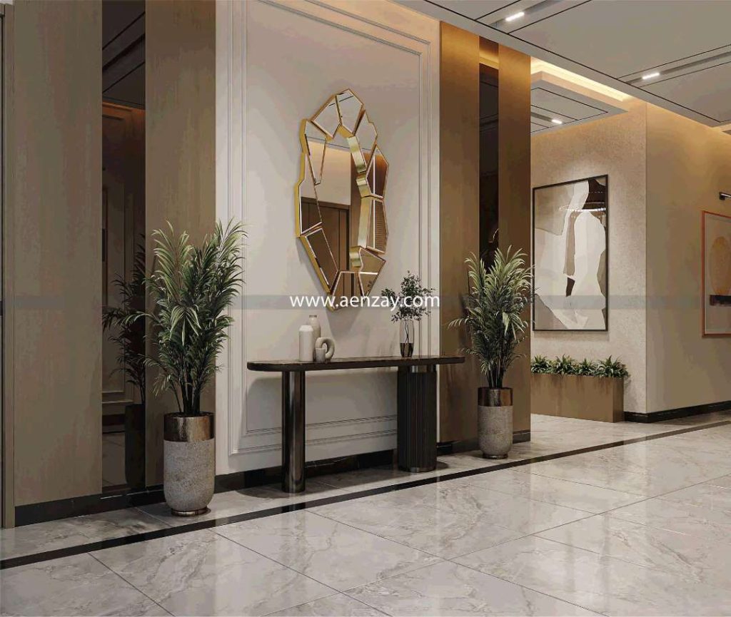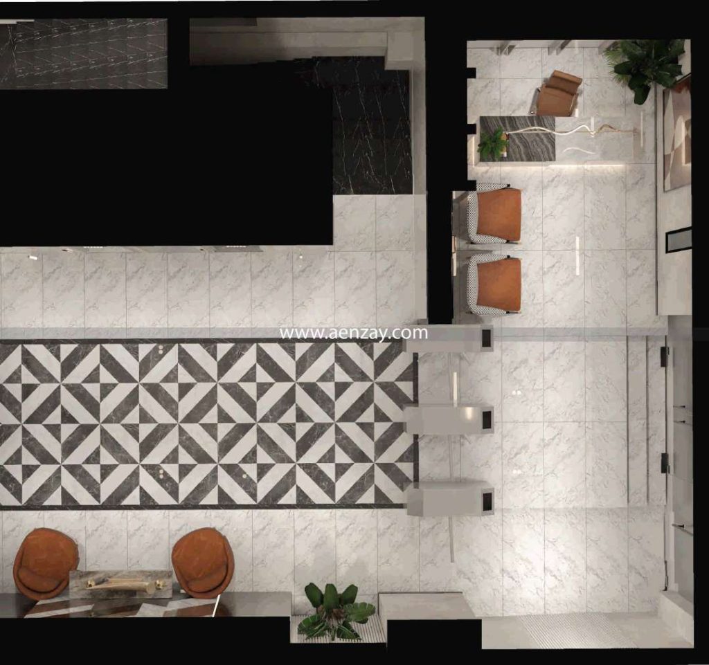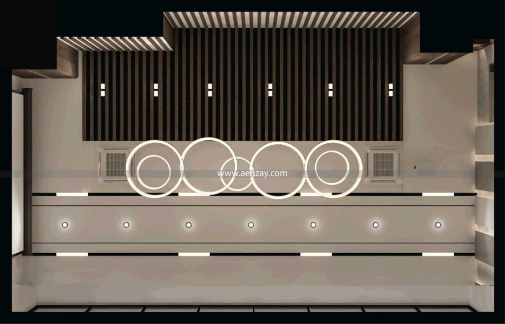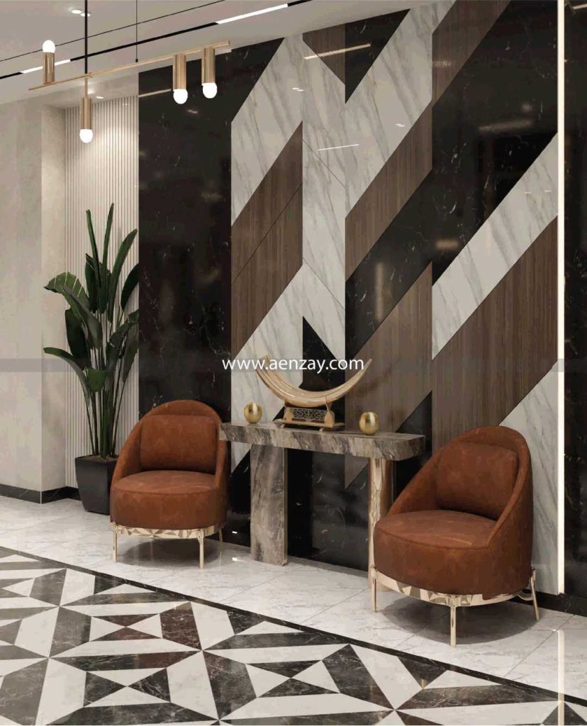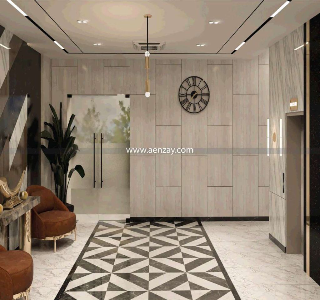 Aenzay designed this space to create a refined and welcoming first impression polished marble flooring geometric patterns and warm lighting define the space while sleek reception desks and comfortable seating support daily use decorative wall details and curated accents add depth and character while greenery keeps the atmosphere soft and balanced creating a space where style flow and function come together